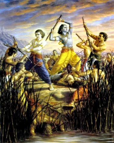 Est id fin om Krschna ed eys folk. Krschna subeiht plur balstehmens, ex qua id senst esti tod swohrn ab Gândharî in Chante XI. Sem dien kun i Yâdavas - est id nam os eys folk - sont samghat, un faydh udbrehct, quanti smyehrnt id. Kwecto est neid danger : sont aunweben. Bet ia neds i karpent iti transforment-se do waghers ed neice mutu tiel el senst. Saul surviver, Krschna biht nicen ab id isu os un sayad. Eys wastu sehnct do id ocean.