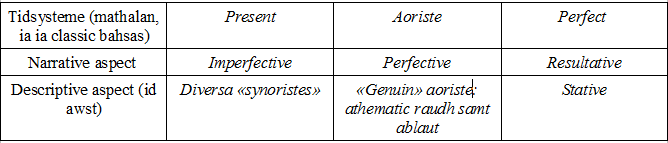 In id descriptive aspect, id "genuin aoriste" eet tod "bare" forme (au tod samt zero stieupen ed thematic voyel pro ia verbs quom forme nieudh id). In id narrative aspect, tod genuin aoriste hat-se dayt inter imperfective ed perfective (opsst-ye) sekwent id actionstype expressen ab id maynen ios verb.