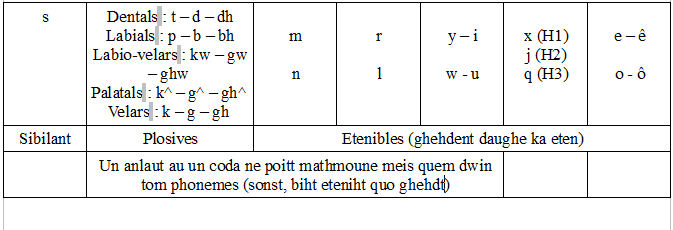 Leitti de id tehxen om oraryios phonemes. Un phoneme est un swonunitat ayn ka talg ab bahsa-on. Mathalan, "kw-" est phoneme pro oraryo esdi, extos, id ghehdiet bihe analyset ka [k] + [w]. Un syllab consist lytst-ye un eten (bariem quo id bahsa ayt ka talg, kam ia voyelihn laryngals, liquids ed nasals oraryios) quo est opsst-ye ambighohrden ab consonns ed semi-voyels. Quo gwehmt pre id eten est id "anlaut", quo apter est id "coda". Phonotactique bestehmt quod syllab est "legal" ("poitt existe") quo duct, in oraryo, ad deduce kweter certain swons (laryngals, nasals, semi-voyels) vahnt wehrge ka voyel (eten) we consonn. Launwerds ed onomatopeias ne sont submiss tibs nyutis (ex: *atta).