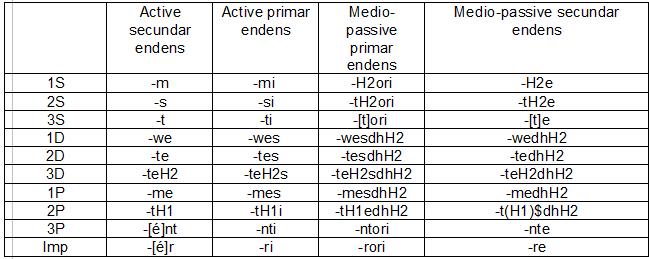Tod conjugation okwivid-ye eet inspiren ex quo tyohc ye id stative, exhibih-yod samlik endens ye id active ed id medio-passive. Mukhtmel-ye, bi-sabab ia confusionsriska con id active, tod conjugation wohrg tik ye id singular, kam id archayic stative. Tod systeme semkam expliet ia irregular formes iom purtbahsas. Mathalan *d'rk^m = dyohrcim